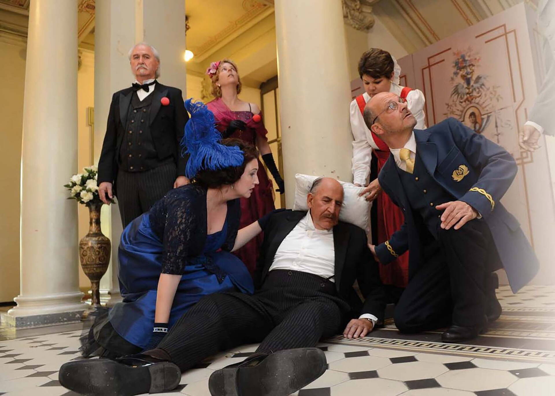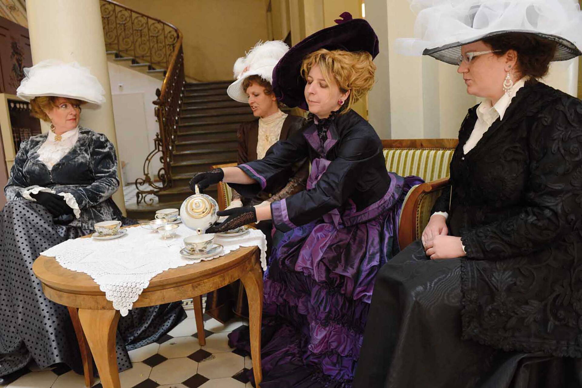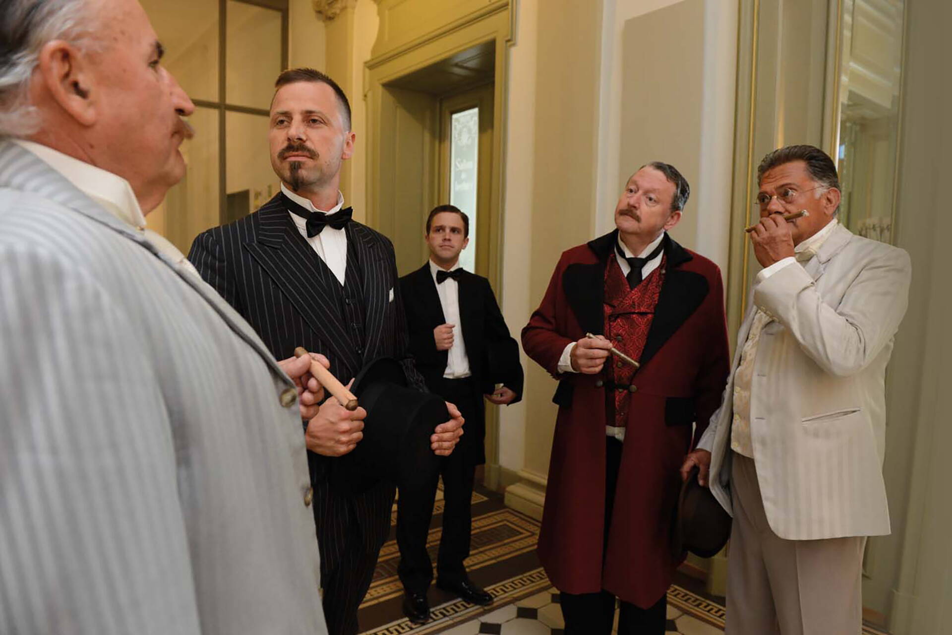 Die Halle des Verwaltungsgebäudes und des Kunstmuseums Thunerhof wurde zur Schauspielbühne. Wo täglich Menschen ein Amt aufsuchen oder ins Museum gehen, wo nüchterne Geschäftigkeit herrscht, spielte am Abend das Ensemble ein packendes und spannendes Gesellschaftsstück am Tatort. Im Zentrum der Bühne stand die wunderbare, geheimnisvoll lichtdurchflutete Eingangshalle mit den neoklassizistischen Säulen, mit dem schönen Treppenaufgang. Im Theaterstück verwandelten wir diese Szenerie des Verwaltungsgebäudes in das «Grandhotel Thunerhof» im Jahr 1914. Wir zeigten die Menschen im Grandhotel in vielen Facetten, erlebten ihre Träume und Ängste, ihr Schicksal und die Tragik ihres Untergangs, ihre Liebe und ihr Glück.