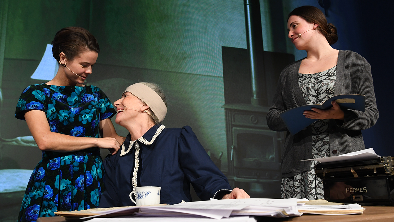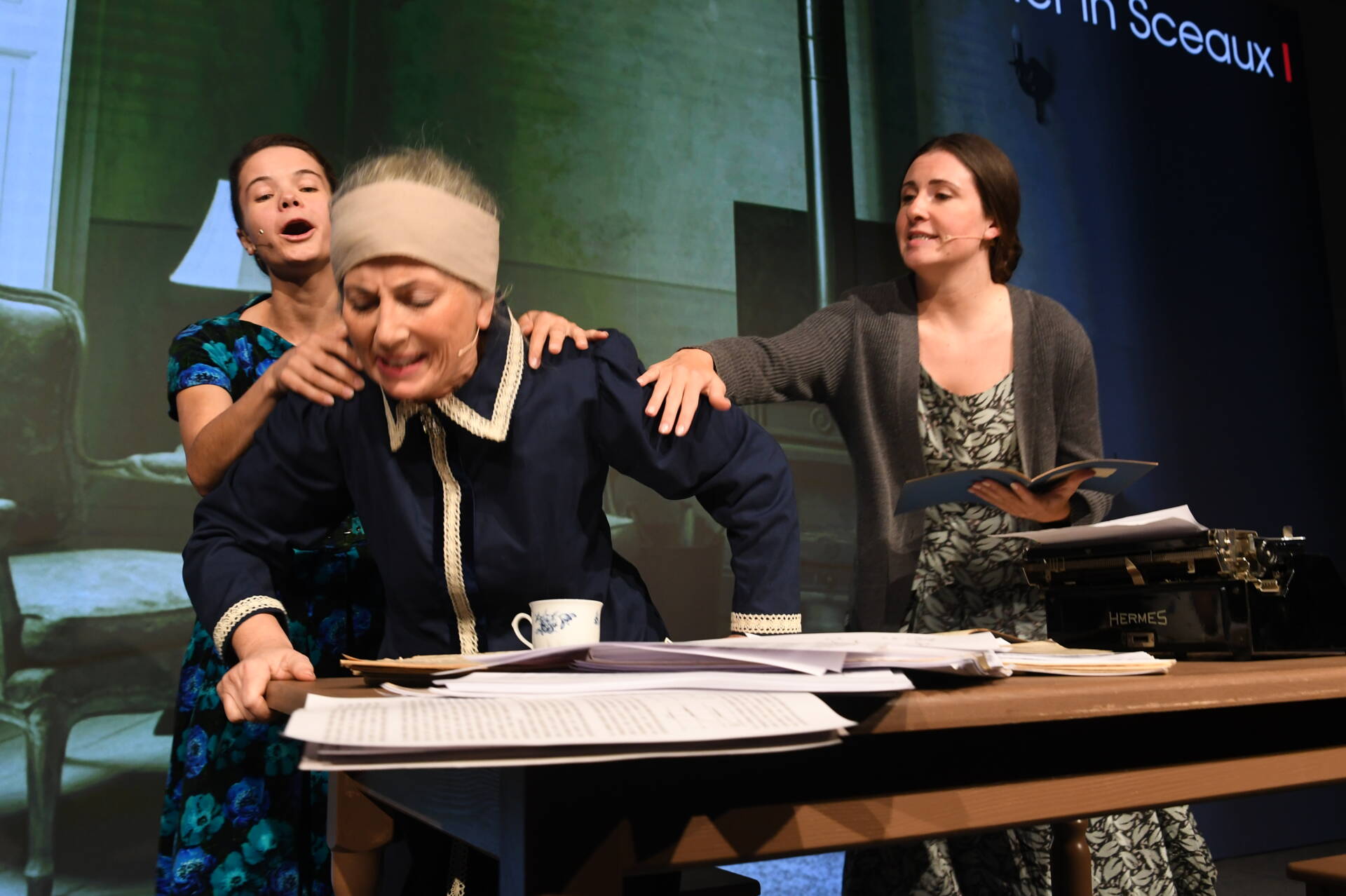 Die Talkmasterin Jessica Born (Tina Fassbind) befragt die ältere Marie Curie (Monika Balsiger) zu ihrem Leben. Foto: Susanne Keller